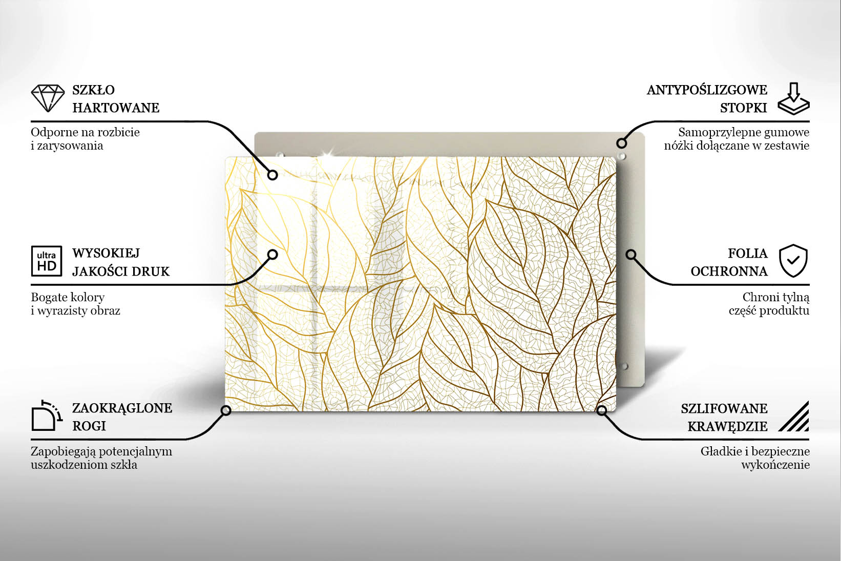 Materiał: bezbarwny akryl lany (PMMA) z nadrukiem na spodniej warstwie