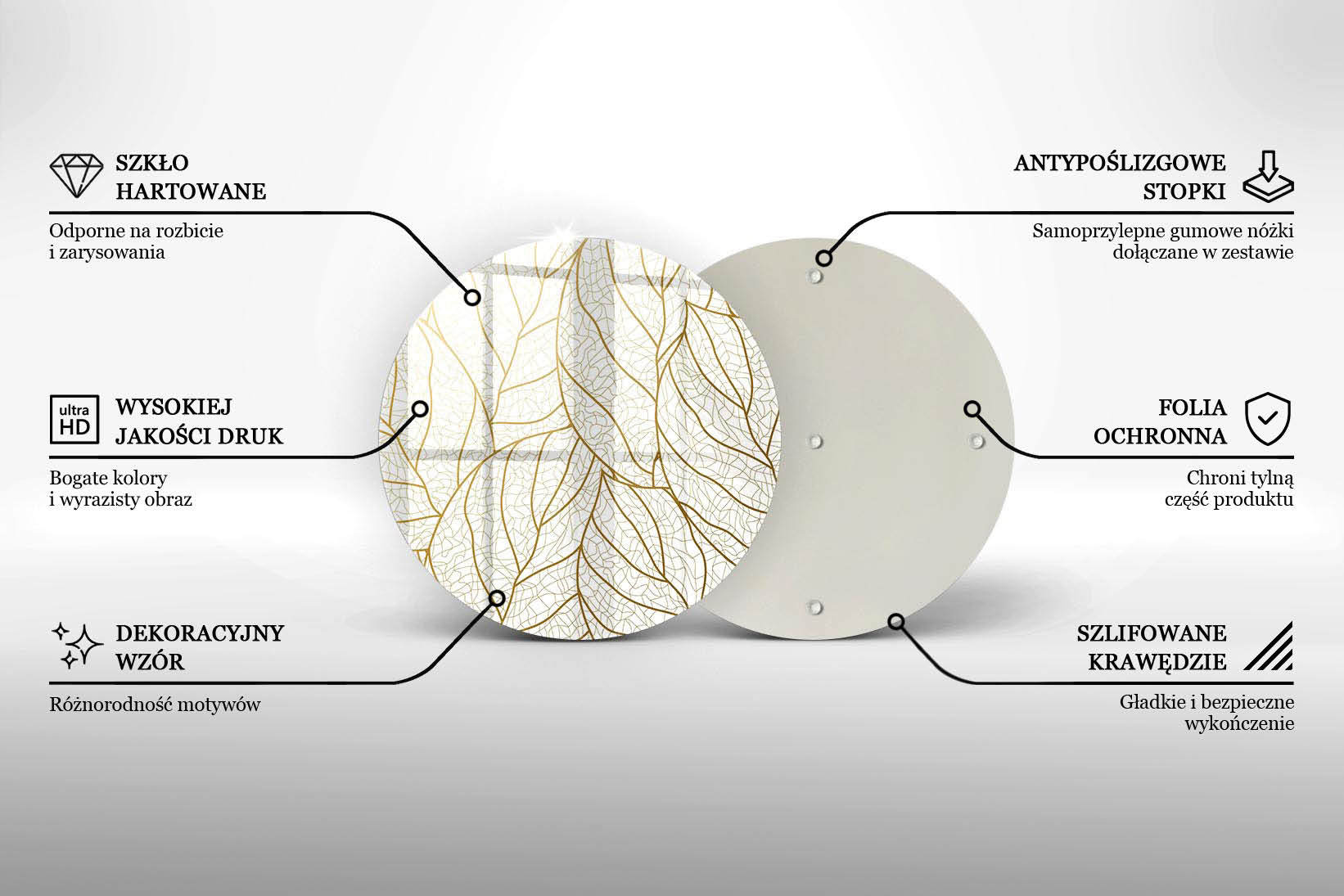 Materiał: bezbarwny akryl lany (PMMA) z nadrukiem na spodniej warstwie